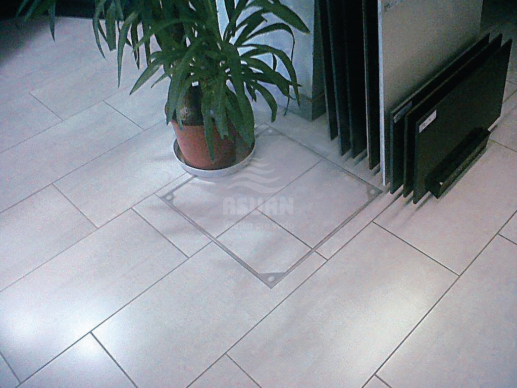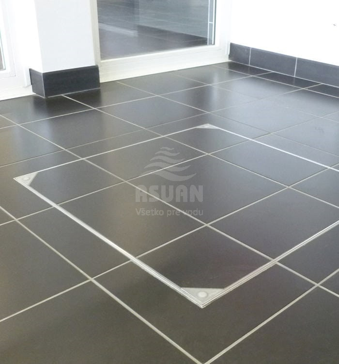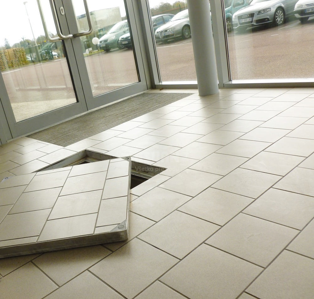 - Po osadení podlahovej krytiny resp. vyšpárovaní keramickej dlažby, sa odstráni silikónové tesnenie, ktoré má zabrániť zatečeniu cementového mlieka pri inštalácii a poklop sa otvorí. Prípadné zvyšky betónu medzi konštrukciou a poklopom sa musia pozorne vyčistiť.
