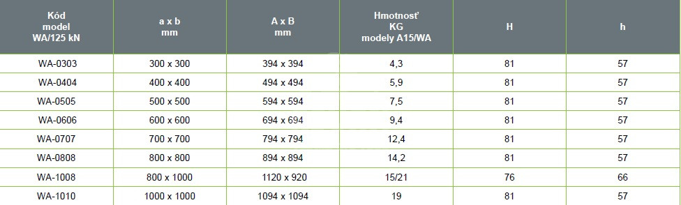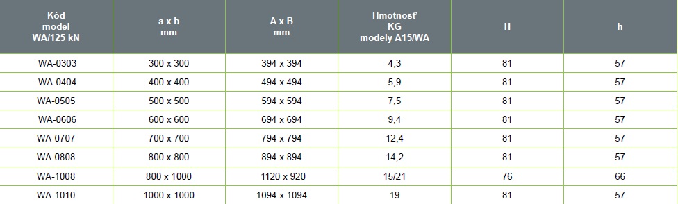 • Skúšobné zaťaženie je 125 KN podľa normy STN EN-124 ak je poklop vyplnený betónom C 35/45 (podľa normy STN EN 206-1)