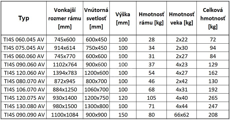 Každé veko je osadené na pántoch, potrebná zdvíhacia sila <300N (menej ako 30kg) mimoTI4S 090.090 AV