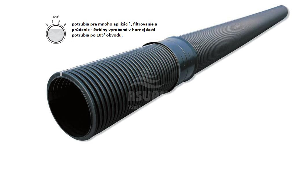 - 120° - potrubia pre mnoho aplikácií, filtrovanie a prúdenie - štrbiny vyrobené v hornej časti potrubia po 105° obvodu