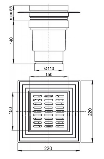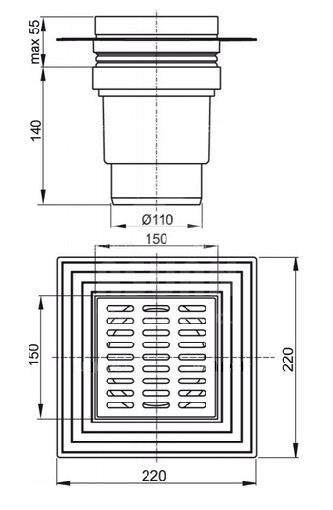 Podlahová vpusť 150x150/110 mm - priama