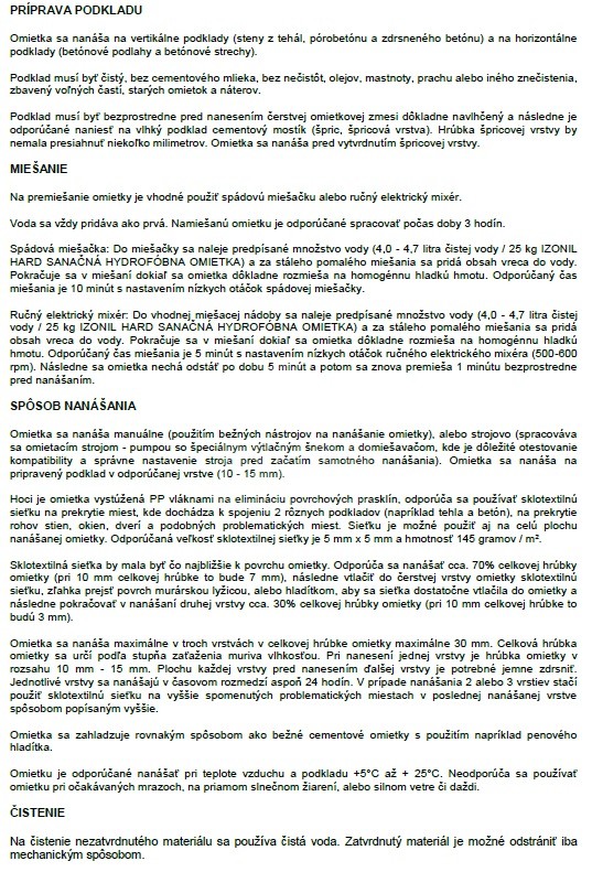 Suchá priemyselne vyrábaná vodonepriepustná a paropriepustná omietková zmes na báze Portlandského cementu, kremičitého piesku, unikátnej prísady (Izocomponent) a vystužená PP vláknami na vonkajšie a vnútorné použitie ako náhrada bežných cementových omietok a sanačných systémov.