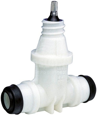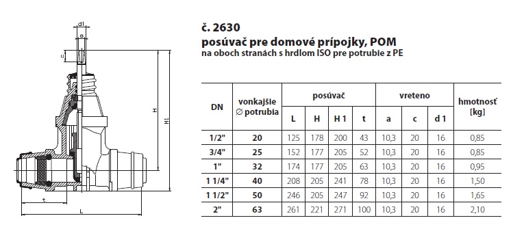 Posúvač ISO pre domové prípojky, z POM na oboch stranách s hrdlom ISO pre potrubie z PE.