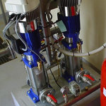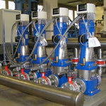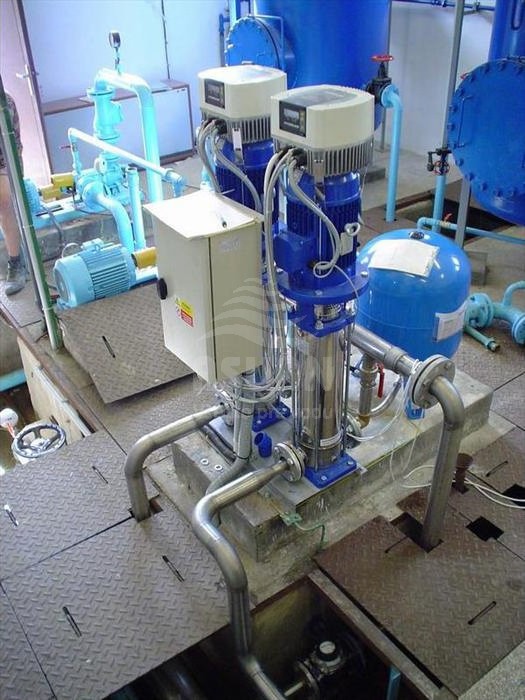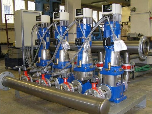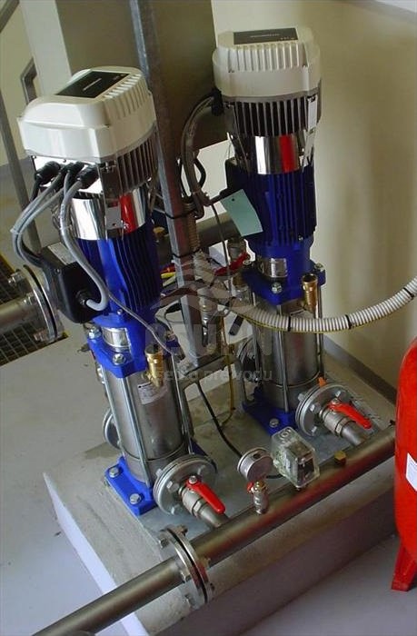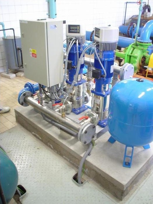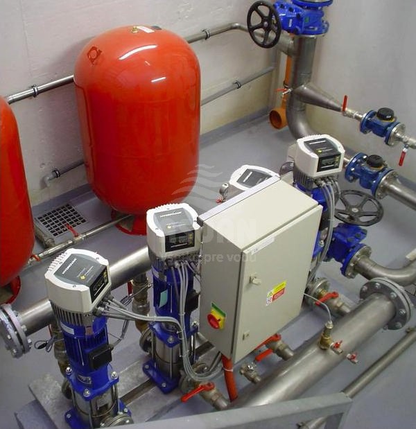 - Použití jednoho nebo několika regulovaných čerpadel v kombinaci s (možná kombinace až s 5-ti čerpadly s konstantními otáčkami) s čerpadly s konstantními otáčkami. Základní provedení regulace zabezpečuje pouze plynulý rozběh a doběh čerpadla, jedno nebo více čerpadel osazených řídícím provedení regulace doregulovává dle požadavků spotřebiště za daných nastavených parametrů (tlak, průtok apod.). Čerpadla bez regulace se připínají a odpínají na základě momentální průtokové spotřeby