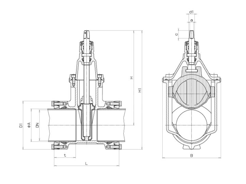 - klin z tvárnej liatiny vo vnútri aj zvonka navulkanizovaným EPDM umožňuje vypúšťanie vody z vrchnej časti posúvača