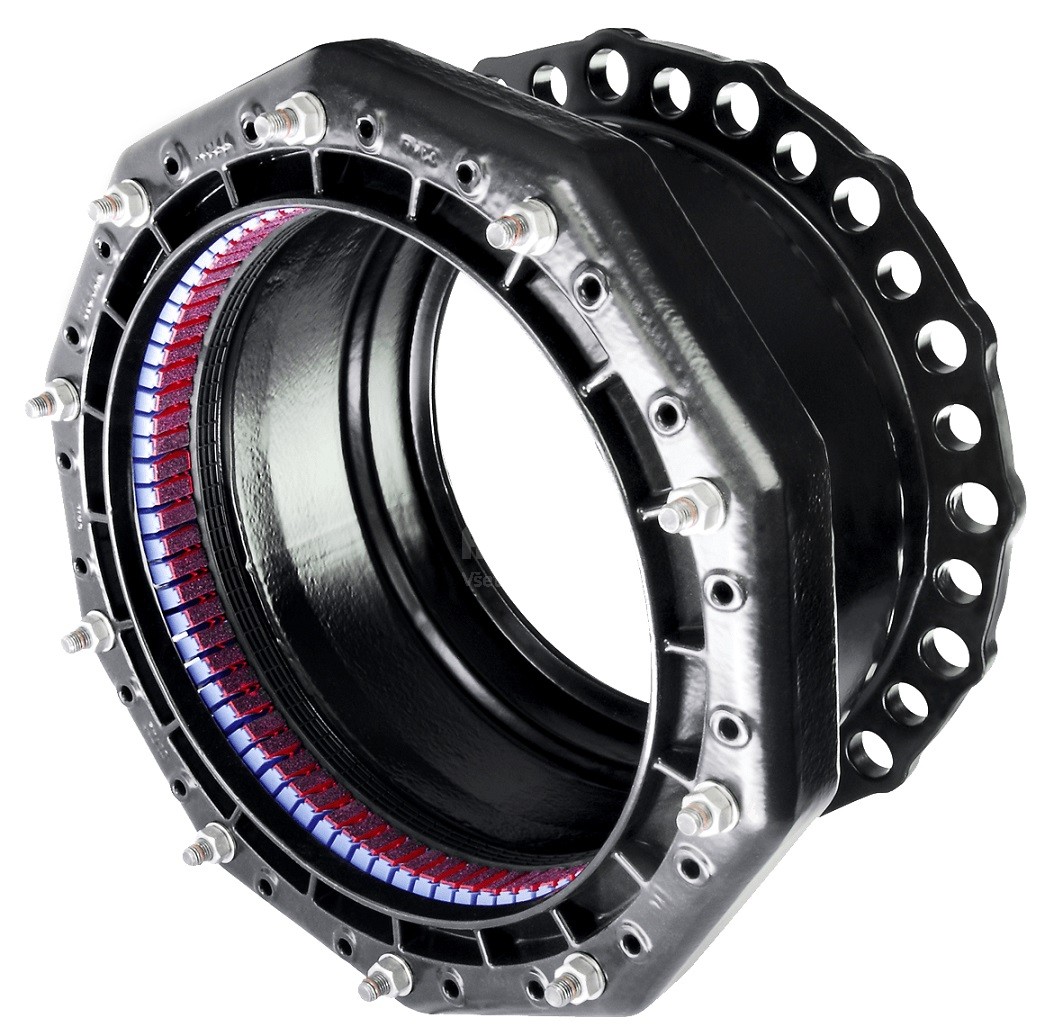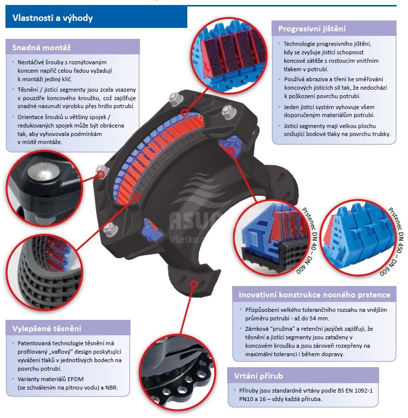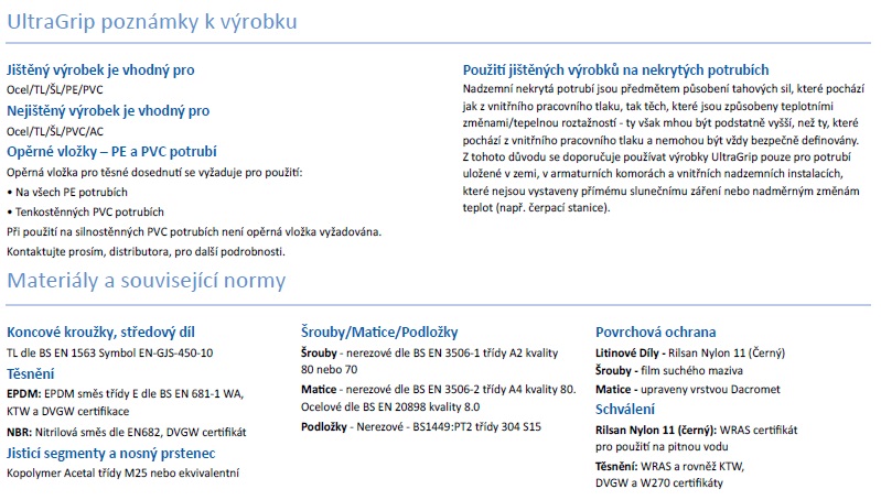 Prírubová spojka s istením proti posunu (spoj so zabezpečením proti posunu/povytiahnutiu) je použiteľná pre oceľ, liatinu, tvárnu liatinu, azbestocement, PVC, PE-HD. (Pri montáži na PE-HD potrubie je nutné použiť vystužovací strmeň - UGSL)